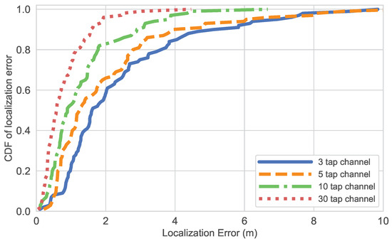 The results show that increasing the channel length improves localization performance. Across all statistical metrics, the mean localization error decreases significantly, from 2.40 m for the 3-tap channel to 0.79 m for the 30-tap channel. Similarly, the median error drops from 1.62 m to 0.58 m. In edge cases, the maximum error and 90th percentile error reduce significantly, as illustrated by the CDF in Figure 10.