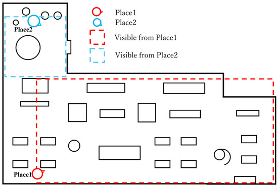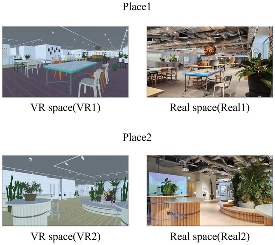 As we described in Section 2.2, we developed a pair of identically designed VR and real spaces. For each set of two spaces, it was necessary to carefully consider the measurement locations. We selected these for both the real space and VR space (Figure 4). Measurement Place 1, corresponding to Place 1 shown in Figure 4, is a space with a large number of furnishings, such as chairs and desks, featuring a significant depth that allows visibility to the back of the room.