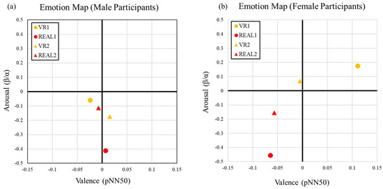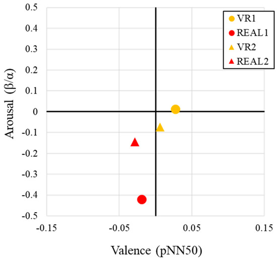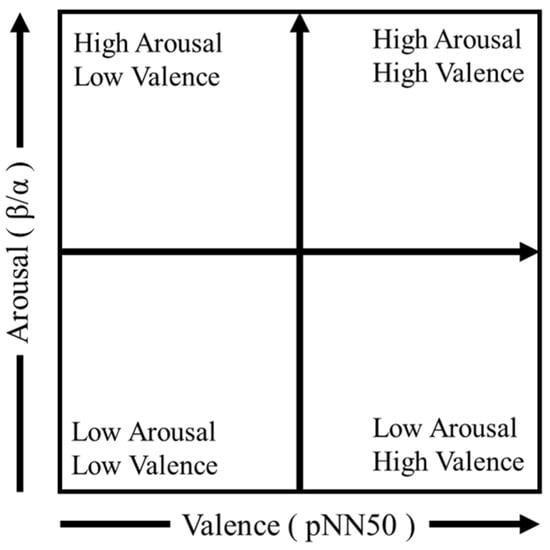 Using this method, emotional responses during VR and real-space experiences were compared based on physiological signals. The β/α ratio was used as the EEG-based arousal index (Y-axis), and pNN50 was used as the HRV-based valence index (X-axis). The structure of the Emotion Map is illustrated in Figure 2.