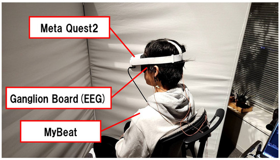 As shown in Figure 3, this experiment employed a head-mounted display (HMD) for VR presentation and two types of sensors to collect physiological data. The HMD used was the Meta Quest 2 [58], which features a resolution of 1832 × 1920 pixels per eye and a refresh rate of 72 Hz. For EEG measurement, the Ganglion Board by OpenBCI [59] was used, which supports a 4-channel input with a sampling rate of 200 Hz. For electrocardiography (ECG), the MyBeat device by UnionTool [60] was employed. This ECG sensor is attached to the chest using dedicated electrodes and has a sampling rate of 1000 Hz.