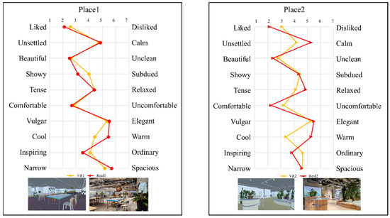 Referring to earlier studies that evaluated impressions and emotions related to spatial elements such as materials [38], lighting [39], and form [40], ten adjective pairs were selected from those previously used (Table 1) [28,38,39,40,41]. These pairs were chosen to comprehensively capture the sensory characteristics of the space. Because these evaluations are based on intuitive impressions, they are considered suitable for comparing how real and VR spaces influence perception.