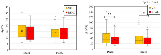 Based on these findings, appropriate EEG indices were selected from the measured signals. EEG reflects electrical activity in the brain and can be classified into several frequency bands based on signal characteristics [47]. Alpha waves are commonly associated with relaxation and restful states [48,49], while beta waves are linked to attention, cognitive activity, stress, and arousal, with their power increasing during heightened arousal [48,49].