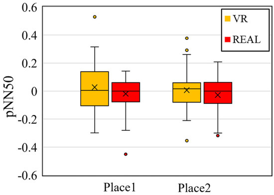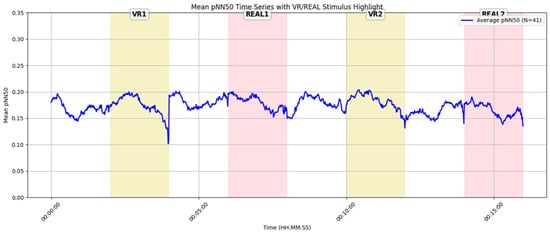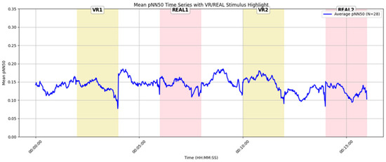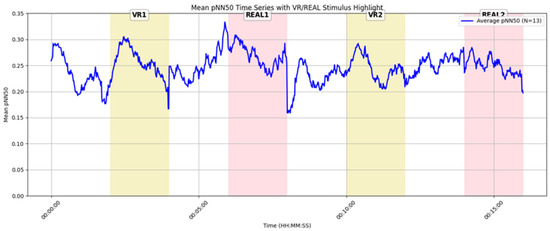 In this study, heart rate variability (HRV) indices were used to capture physiological responses during experiences in virtual reality (VR) and real spaces, as indicators of emotional states. HRV indices quantify fluctuations in heart rate over time. Among various HRV measures, we employed pNN50, a primary time-domain metric for quantifying HRV [52]. pNN50 enables emotion-related HRV analysis within very short time intervals [52], and it is known to be strongly associated with parasympathetic nervous activity [52]. Higher pNN50 values are interpreted as reflecting emotionally relaxed states with lower psychological stress [52,53], whereas lower values suggest higher psychological tension or stress [52,53]. Emotionally relaxed states are generally categorized as positive emotions, and psychologically tense states as negative emotions. Based on these associations, this study used the time-series variation in pNN50 to evaluate emotional changes during the spatial experiences.