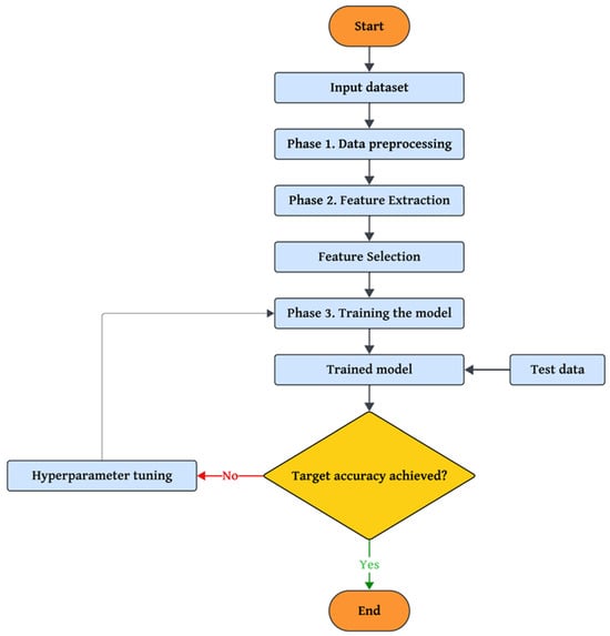 The proposed approach consists of three main phases, each playing a key role in enhancing the system’s performance using advanced algorithms. In the first phase, data preprocessing techniques such as the Median-KS Test are employed to eliminate noise and identify valid data. Additionally, advanced methods are applied to handle missing values, balance datasets, and prepare categorical features, transforming raw data into an analyzable format. In the second phase, feature selection and optimization, a Genetic Algorithm (GA) enhanced with eagle-inspired search strategies is employed to identify and select the most influential features, effectively reducing the dimensionality of the data while maintaining high classification performance. In parallel, hyperparameter tuning is performed using a simulated annealing (SA) algorithm, which is further improved by integrating dragonfly-inspired swarm behaviors (alignment, cohesion, separation) to enhance exploration and exploitation capabilities during the search for optimal model parameters. Finally, a combination of three machine learning algorithms, Decision Tree, Random Forest, and XGBoost, is used to classify the data. This three-phase structure offers a comprehensive and practical approach to detecting and countering security threats in the IoT environment. A flowchart of the proposed method is shown in Figure 1.