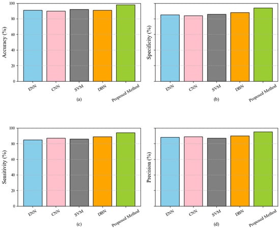 Performance comparison of classification models (ENN, CNN, SVM, DBN, and proposed method) across evaluation metrics: accuracy (a), specificity (b), sensitivity (c), and precision (d).