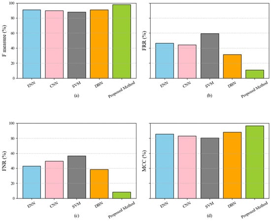 Performance comparison of classification models (ENN, CNN, SVM, DBN, and proposed method) across evaluation metrics: F-measure (a), FPR (b), FNR (c), and MCC (d).