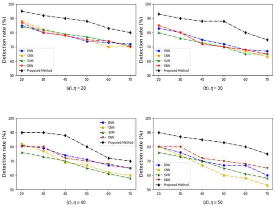 To evaluate the robustness of the proposed method under various threat levels, training datasets with different attack percentages (20%, 30%, 40%, and 50%) were generated. This was achieved by adjusting the ratio of botnet to normal traffic using a combination of random under-sampling (for majority class) and over-sampling (for minority class) strategies on the training set without altering the test set. Due to the inherent imbalance in the CTU-13 dataset, the Synthetic Minority Over-sampling Technique (SMOTE) was applied on the training data to generate synthetic samples for the botnet class. This ensured a more balanced dataset, improved the model’s ability to learn minority class patterns, and enhanced overall classification performance. Figure 4 illustrates the detection rate performance under varying attack percentages (η) and different proportions of at-risk devices (from 20% to 70%). Subplots (a), (b), (c), and (d) correspond to attack percentages of η = 20%, η = 30%, η = 40%, and η = 50%, respectively.