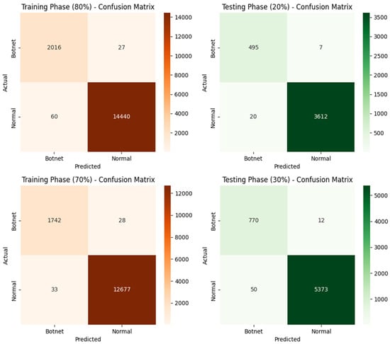 Figure 5 illustrates the confusion matrices for training and testing phases at varying percentages of data utilization. In the 80% training phase, the method achieves remarkable results with only 27 false positives and 60 false negatives, indicating high precision and sensitivity in detecting botnet activity. Similarly, the model maintains consistent performance in the 70% training phase, with a minimal increase in false positives (28) and a slight reduction in false negatives (33). This demonstrates the robustness of the proposed approach in accurately identifying botnet and normal traffic, even with reduced training data. During the 20% testing phase, the confusion matrix shows only 7 false positives and 20 false negatives, reflecting the model’s high generalization capability and ability to accurately predict botnet instances under unseen data conditions. The model performs exceptionally well in the 30% testing phase, with just 12 false positives and 50 false negatives. This indicates the scalability and reliability of the proposed method in handling larger test datasets.
