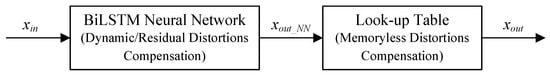 Over the last few years, machine learning techniques have been widely used for the enhancement of base stations efficiency in wireless communication systems through predistortion applications [,,,,,,,,,,,,,,]. Indeed, several types of neural networks, such as conventional feedforward neural networks [,], and their augmented versions [], convolution neural networks (CNNs) [,,,], recurrent neural networks (RNNs) [,,], and vector decomposition based neural networks [,], have been proposed as digital predistortion functions. Among these, convolution neural networks and long-short term memory (LSTM) neural networks have demonstrated highly attractive features with their ability to capture intrinsic behavior of the power amplifier and hence allow for maintaining the predistorter performance over a wide range of operating conditions [,,]. Recently reported results demonstrated the ability of the bidirectional LSTM (BiLSTM)-based neural networks to achieve signal agnostic performance [].