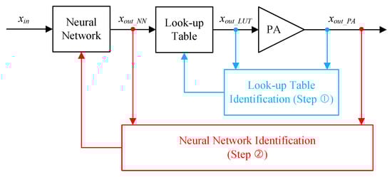 In this work, the second approach was adopted for the identification of the LUT-A-BiNN DPD function and its experimental validation. The identification process of the proposed LUT-A-BiNN DPD is depicted in Figure 3. The DUT is first characterized and its baseband input and output waveforms and are used to derive the LUT based memoryless predistorter. This first step uses the inner characterization loop. The LUT predistorter is then applied to linearize the DUT, and the input and output baseband waveforms of the cascade made of the LUT DPD and the DUT (that is and ) are used to train the NN-based predistortion function. This second step uses the outer characterization loop. The selection of this sequential identification approach is mainly due to the demonstrated ability to extend the correction bandwidth of an experimental setup [,]. In our case, this was needed due to the limited bandwidth capability of the experimental setup (125 MHz), which is much lower than the optimal bandwidth (200 MHz) required for the used 40 MHz test signal.