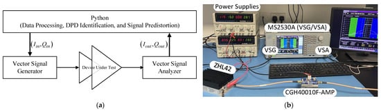 The experimental setup used in this work consists of the MS2830A (from Anritsu, Kanagawa, Japan) which includes a vector signal generator and a vector signal analyzer in the same chassis. The instrument has a maximum signal generation and analysis bandwidths of 125 MHz. Hence, limiting the bandwidth of the signal being used in the experimental validation to 40 MHz. The device under test is made of a two-stage power amplification system. The main amplifier is the CGH40010F-AMP evaluation board from Wolfspeed, Durham, NC, USA. The ZHL42 (from Minicircuits, Brooklyn, NY, USA) was used to drive the main amplifier. All digital signal processing, including identifying both DPD functions and predistorting the input signal, were implemented in Python 3.10. A block diagram of the experimental setup is shown in Figure 4.