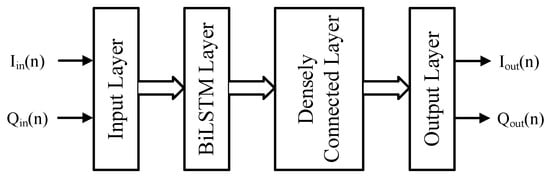 A significant advancement in LSTM architecture is the bidirectional long short-term memory networks, which are designed specifically to utilize data from sequential data’s past and future time steps. By using two distinct LSTM layers, one of which processes input in a forward sequence and the other in a reverse sequence, BiLSTMs improve the model’s understanding of temporal links by including contextual features from both sides []. This bidirectional method improves the performance of BiLSTMs in many applications by allowing them to effectively capture context and long-range correlations in data sequences. A BiLSTM-based DPD model was presented in []. It consisted of a 300-neuron BiLSTM layer, which is followed by two fully connected layers with 150 and 200 neurons, respectively. The BiLSTM-based architecture performs better than the unidirectional LSTM-based architecture at the expense of additional memory state coefficients.