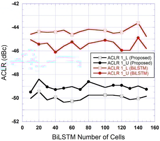 The first step of the experimental validation consisted of assessing the impact of the number of parameters of the BiLSTM sub-block on the performance of the proposed two-box DPD. Based on Equation (7), it appears that the impact of on the total number of the BiLSTM parameters is much more significant than that of . For this work, was varied from 10 to 150 and the was varied between 80 and 200 with the aim of minimizing the overall number of parameters in the model while maintaining an ACLR of approximately . The target ACLR value was selected to allow for a margin with respect to the 5G minimal requirement of . From this study, it was found that for , the targeted ACLR could be met with the lowest complexity. Figure 7 presents the measured ACLR at the output of the device under test as a function of for the proposed DPD and for the standalone BiLSTM DPD. These results show that the proposed DPD consistently outperforms the standalone BiLSTM DPD by approximately 5 dB. Furthermore, the proposed DPD achieves the desired performance for , while the standalone BiLSTM DPD is unable to reach this performance even for much larger values of .