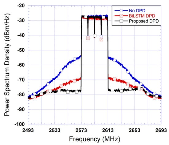 The measured spectra at the output of the DUT for the proposed DPD and the standalone BiLSTM DPD are reported in Figure 8. In this figure, both DPD are derived for and . This figure shows that the proposed DPD was able to linearize quasi-perfectly the DUT. These results also show a noticeable enhancement in performance when compared to the standalone BiLSTM predistorter.