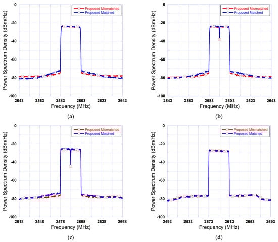 Measured spectra at the output of the linearized DUT using proposed matched and mismatched DPD. (a) 20 MHz 1-carrier signal, (b) 20 MHz 2-carriers signal, (c) 30 MHz 2-carriers signal, (d) 40 MHz signal 1-carrier signal.