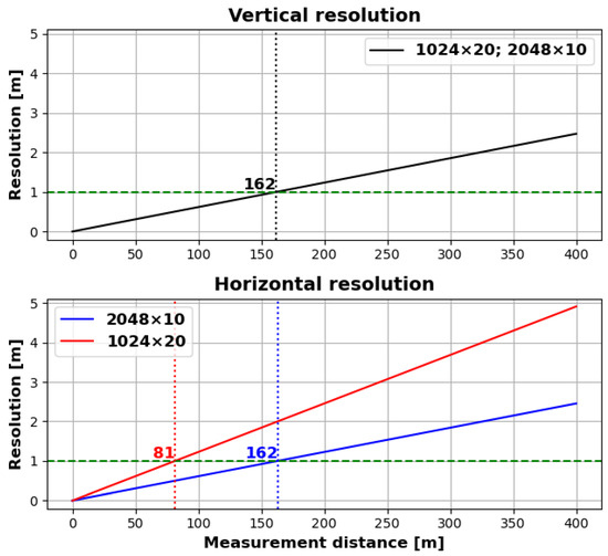 Increase in distance between measurement points (i.e., decrease in spatial resolution) in vertical and horizontal directions over nominal LiDAR measurement distance. The dotted lines indicate the distance at which a resolution of 1 metre is achieved.