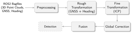 Given the stationary nature of the sensor nodes during data acquisition, the point cloud registration needs to be conducted only once in order to obtain the required transformations. The process is displayed in Figure 4. Given the importance of an initial alignment for ICP registration, we compute preliminary transformations based on the GNSS position and heading data provided by the GNSS receivers on the sensor nodes. The GNSS positions are projected into a local Cartesian coordinate system using the Universal Transverse Mercator (UTM) projection methods from [28]. The sensor nodes are assigned numerical identifiers. The local origin is defined in accordance with the position of the initial sensor node. In order to ensure compatibility with the ROS standards, the system adheres to the East-North-Up (ENU) convention [29]. The resulting transformations represent the translation and rotation from the ENU coordinate system to each sensor node coordinate system, which is identical to the LiDAR coordinate system of the respective sensor node.
