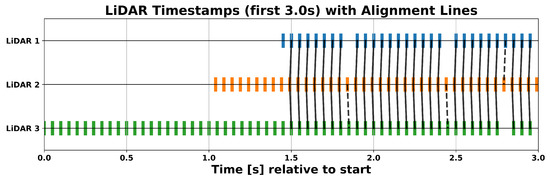 Alignment of LiDAR timestamps over the first 3 s of measurement using Dynamic Time Warping. Vertical lines connect the closest matching timestamps between each sensor’s stream and the reference (LiDAR 1), illustrating how DTW compensates for slight timing offsets and variable sampling intervals before ICP registration.