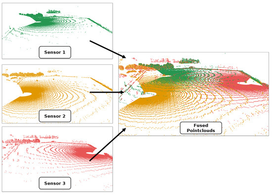 Individual point clouds captured by three sensors (green, orange, and red), and their combined (fused) point cloud, which is subsequently used for the detection.