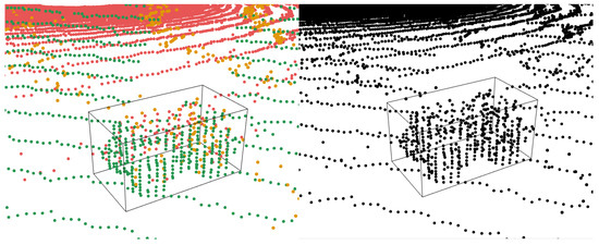 Visualisation of fused 3D point cloud data with an oriented bounding box highlighting the tracked robot. The left image shows colour-coded data points from multiple sensors, while the right image displays a monochrome version of the same data for clarity.