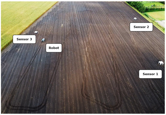 Drone image during the implementation of the described experiment on a real agricultural field. The positions of the sensors and the pavilions directly behind the sensors can be seen. The robot can also be seen following its planned path (tracks are visible on the field).