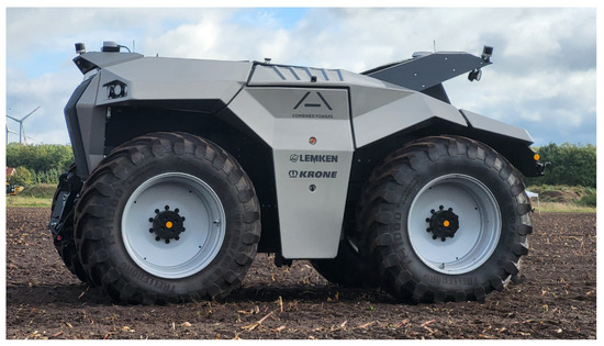 The autonomous agricultural robot used in the field experiment. The vehicle was provided and supervised by Maschinenfabrik Bernard Krone GmbH & Co. KG and developed in collaboration with LEMKEN GmbH & Co. KG as part of the Combined Powers project.