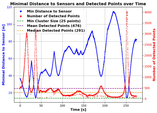 Minimal distance to the sensor and number of detected points over time. The blue curve (left y-axis) shows the minimal distance to the sensor, and the red curve (right y-axis) shows the number of detected points. The horizontal dashed green line indicates the minimum cluster size (25 points). The horizontal dashed orange line indicates the mean number of detected points (476 points), and the horizontal dashed purple line indicates the median number of detected points (291 points).