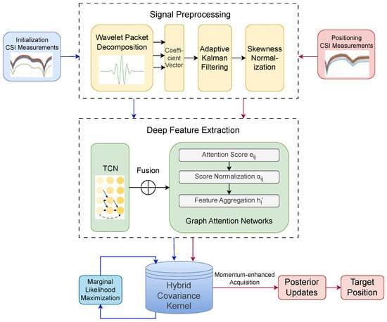 where and are learnable parameters of the GAT layer. The final output of this stage is a feature vector for each reference location . The TCN and GAT models are trained offline using the preprocessed fingerprint data , typically aiming to optimize a loss function related to position estimation or feature discriminability. Let the resulting feature database be .