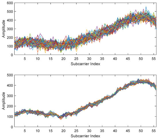 Each representative signal vector (or potentially each raw ) undergoes a three-stage preprocessing pipeline to mitigate noise and artifacts inherent in CSI measurements. Let denote a signal vector input to this stage. The sequential design of this pipeline is motivated by the hierarchical nature of noise in CSI signals and empirical validation across diverse environments. Wavelet decomposition first isolates high-frequency noise components, Kalman filtering then tracks low-frequency signal dynamics, and skewness normalization finally addresses asymmetric distortions from multipath propagation. This order prevents distortion amplification (e.g., normalizing before filtering would amplify Kalman’s residual errors) and aligns with the noise characteristics observed in our experimental data.