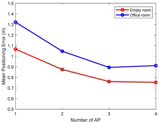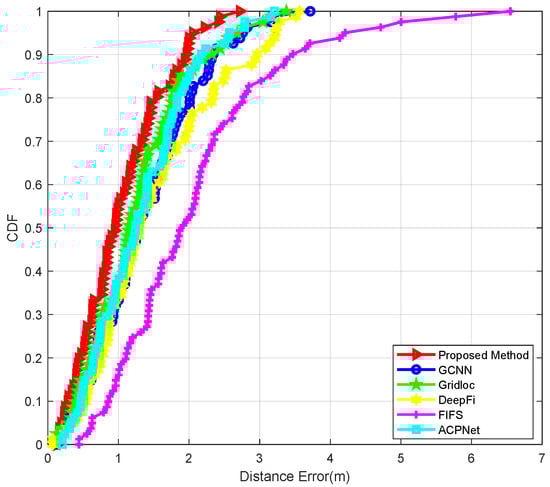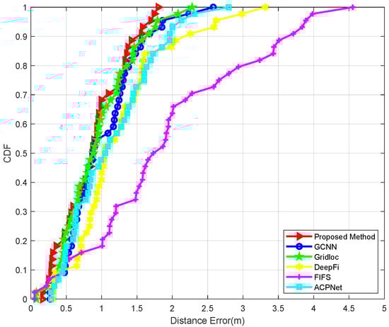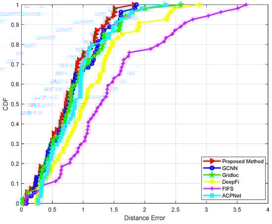In the empty room scenario (Table 1), which represents a near-ideal environment with minimal multipath interference, the proposed method achieved superior performance with a mean error of 0.7608 m. This result underscores the fundamental efficacy of our model’s feature extraction and spatial modeling capabilities even under baseline conditions. In contrast, the conventional FIFS method exhibited the highest mean error (1.4557 m), attributable to its reliance on averaged CSI amplitude features that fail to address temporal–spatial signal dynamics. DeepFi (1.1157 m) and the newly introduced ACPNet (0.9034 m) demonstrated the advantages of using deep learning for feature extraction. Notably, ACPNet’s use of intra-sample attention mechanisms to weigh subcarriers and antennas allows it to refine CSI features more effectively than DeepFi’s single-scale architecture, resulting in better accuracy. However, both GCNN (0.8350 m) and Gridloc (0.8746 m) outperformed ACPNet. This is because, as argued in our related work review, ACPNet’s “inward-facing” attention operates only within a single CSI sample and does not explicitly model the spatial relationships between different APs. Methods like GCNN, which model the physical topology, and the proposed method, which models the signal manifold, gain a distinct advantage by capturing this crucial inter-AP spatial information, leading to lower positioning errors even in this relatively simple environment.