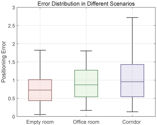In the office environment with obstacles (Table 2), the introduction of complex multipath propagation provides a more rigorous test of each model’s robustness. The proposed method maintained its leading performance with a mean error of 0.8943 m, showing a modest degradation of only 17.5% compared with the empty room. This resilience highlights the effectiveness of our framework’s skewness-adaptive filtering and dynamic Kalman updates in suppressing the non-Gaussian noise prevalent in such environments. The performance gap between our method and others widened significantly. For instance, ACPNet’s mean error increased to 1.1517 m, a performance degradation of 27.5%. This larger increase empirically validates the critique of its architecture: in an environment with obstructions, the reliability of signals from different APs varies drastically. ACPNet’s inability to model these dynamic inter-AP correlations means it cannot adaptively fuse features from the most reliable sources, leading to a substantial drop in accuracy. In contrast, our method’s graph attention fusion mechanism is explicitly designed to learn these correlations, providing superior robustness. While Gridloc’s hybrid approach (0.9538 m) offered some adaptability, its reliance on Euclidean metrics for spatial relationships still resulted in a 6.6% higher mean error than our geometrically aware model.