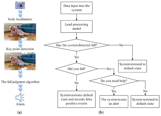 The architecture of the fall detection system is as follows: After capturing images via a camera, the system employs the improved YOLOv8 for human body localization to obtain bounding box information and then uses the BAM-HRNet network to extract key-point details. By analyzing the dynamic trends of key points, the system determines whether a fall has occurred. Upon detecting a fall event, it triggers the voice inquiry module to verify whether assistance is required. (a) System overview. (b) The processing flow of the system after detecting a fall.