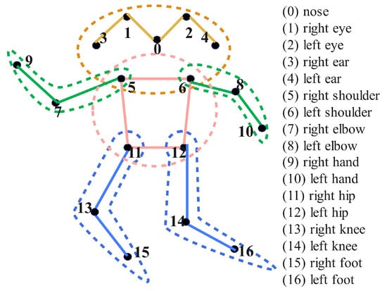 To better enable the model to learn the connection of human key points, the 17 human key points are grouped into four categories for training: head, arms, body, and legs. The numbering of key points and their corresponding body parts are illustrated in Figure 2. The experimental results are shown in Table 1, the results indicate that group training can enhance the model’s ability to learn the connection relationships of key points. By constraining the human body, the proposed algorithm enhances the perception of relationships between key points, which facilitates the model to locate human key points in occluded scenarios successfully.
