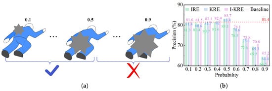 The illustration of different random erasing levels. (a) Example of occlusion ratio. When the occlusion factor is in the range of 0.1–0.5, the performance will increase. (b) Comparison results of different random erasing levels. On the COCO datasets, the comparison results of key-point detection accuracy obtained by performing IRE, KRE, and I-KRE operations with rectangular blocks of different sizes.