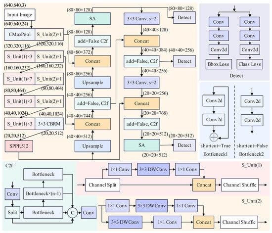 Figure 4 shows the network structure of the improved YOLOv8. The ShuffleNetV2 [] network, which has channel shuffle, point-wise group convolution, and consists of basic units with depth-wise separable convolutions and down-sampling units, serves as the lightweight backbone of the improved YOLOv8.