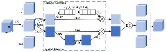 The network architecture of SA. The SA mechanism, also known as group attention mechanism, performs spatial feature extraction and channel information enhancement processing on sub-features separately and finally mixes and fuses the features of each branch. The number of groups is 2 in the study, i.e., .