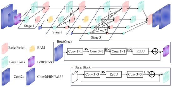 To reduce the overall size of the network, two 3 × 3 convolutional layers with a stride of 2 are used to decrease the image size to one-quarter of the original. Then, BottleNeck blocks with 1 × 1 convolutions, and multiple activation functions are employed for feature extraction. The module allows more layers to be used with lower computational resources, enabling the Basic Block to apply more non-linear transformations for feature learning. Subsequently, the extracted features are processed through up-sampling and down-sampling operations to obtain features at corresponding resolutions, with Basic Fusion completing the information integration from different receptive fields. Afterward, under the premise of maintaining high resolution, multi-resolution parallel transmission is achieved to facilitate seamless feature information interaction across different scales. At each stage of the BAM-HRNet network, the size description of the characteristic diagram is shown in Table 2.