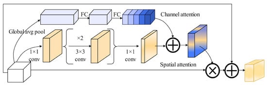 The spatial attention branch produces the spatial attention map to emphasize or suppress features at different spatial locations, which helps determine which spatial positions require more focus. Dilated convolutions are used to expand the receptive field. The literature [] has demonstrated that dilated convolutions are more effective than standard convolutions in constructing spatial feature maps. Specifically, when features are mapped to , a 1 × 1 convolution is used to aggregate and compress the feature maps along the channel dimension. For convenience, the channel branch uses the same reduction ratio. Subsequently, two 3 × 3 dilated convolutions are applied to leverage contextual information. Finally, a 1 × 1 convolution is used to reduce the features back to the spatial attention map to adjust the scale. Batch Normalization layer is applied at the end of the spatial branch. The spatial attention is computed as Equation (2).