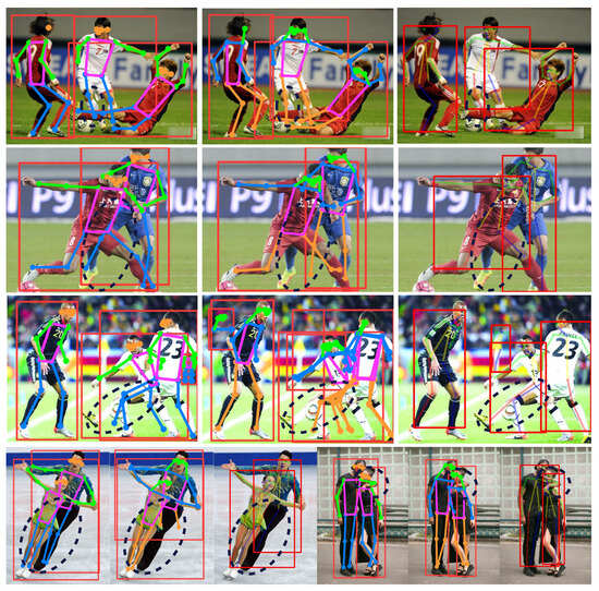 Clearly, the proposed method provides more accurate predictions for some occluded key points, with differences highlighted by black dashed ellipses in the detection results. In the first row, YOLOv8s-pose fails to accurately locate the key points of a person in white clothing bending their knee, while Lightweight OpenPose performs better. However, the proposed method shows comparable accuracy to Lightweight OpenPose. In the second row, the proposed method correctly identifies the occluded leg of an athlete in blue, whereas the other two algorithms fail. In the third row, after the leg of a white-clad athlete is partially obscured by a soccer ball, both the proposed method and YOLOv8s-pose exhibit detection shifts, while Lightweight OpenPose accurately locates the leg. In the fourth row, the first set of visualized data shows that only the proposed method detects all key points of a male dancer accurately, while the other two methods fail to recognize them. In the second set of visualized data in the fourth row, all three algorithms accurately identify human body key points. In summary, although the proposed algorithm may have slight deviations in detecting occluded key points—especially when the subject wears light-colored clothing and is obscured by similarly colored objects—it outperforms other algorithms overall in human pose estimation under occluded scenarios. This method enhances the detection accuracy of occluded key points, which is more conducive to accurately identifying fall conditions.
