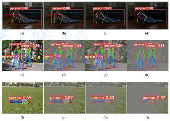 Figure 11 shows the visualization results of key-point detection under different light intensities. From the detection results, it can be seen that the proposed algorithm can effectively extract key points of the human body in both dimly lit indoor and foggy outdoor environments.