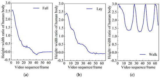 Figure 12 shows a comparison of the changes in body features for different behavioral states. By observing the curve, when , the height-to-width ratio of normal walking behavior exhibits a regular periodic fluctuation every 15 frames. However, when , the lying behavior in normal human activities is very similar to the height/width ratio after falling, which cannot be judged by setting the ratio threshold. However, by observing the curve between 0 and 40 frames, it is found that the falling speed of the numerical change curve of the height/width ratio of the human body in the lying behavior is slower than that in the falling process. This is because the centroid descent speed during uncontrolled accidental falls is faster than that in daily behaviors.