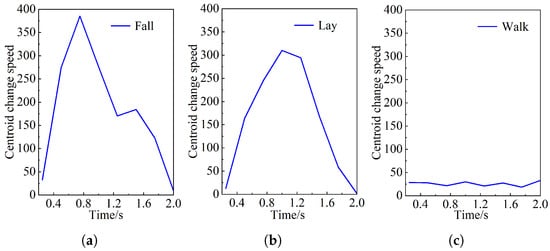 Centroid change speed of human body. (a) Falling, (b) lying, and (c) walking.