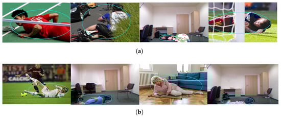 The datasets for fall detection consist of two public datasets and a self-built dataset. The Fall Detection Dataset (FDD) [] includes approximately 20,000 images of different postural behaviors simulated by 5 participants indoors, covering various typical action scenarios. The UR Fall Detection Dataset (URFD) [] contains 30 fall events and 40 daily life behavior image sequences, focusing on indoor scenarios for the elderly living alone. The self-built datasets target outdoor public spaces, comprising 1307 fall images in diverse scenarios and 50 videos with different fall postures, complementing the public datasets by addressing scene diversity and establishing a more comprehensive cross-scenario testing framework. The datasets are labeled using the Make Sence online labeling platform.