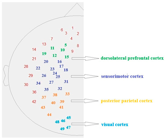 The fNIRS system (NIRScout, NIRx Medical Technologies LLC, Glean Head, NY, USA) measured brain activity with 16 near-infrared light sources and 16 detectors. The configuration of the measuring probes was designed to record signals from selected areas of the brain’s left hemisphere, including the visual (occipital), parietal, motor, and prefrontal cortex. The arrangement of the measuring channels was determined based on EEG 10–20 standards (Figure 1). The entire apparatus was placed in a room with controlled lighting conditions to limit the influence of external light.