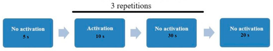 Scheme of study. Activation is stimulation with passive observation (protocol P) or an interactive task with Nefroball (protocol A). Each condition consisted of a short baseline rest, followed by three repetitions of alternating “no activation” and “activation” blocks, and a final rest. “No activation” blocks correspond to resting periods used to reduce carryover effects and allow the signal to return to baseline between tasks.