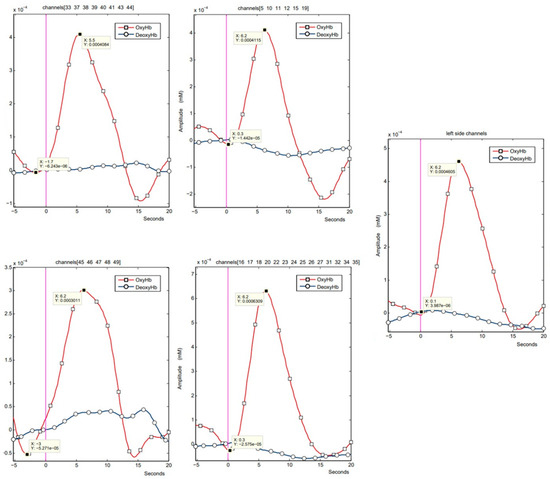 Examples of fNIRS signal recordings for the individual areas analysed. Time is shown in seconds on the x-axis; ΔHbO values are in mmol/L on the y-axis. The channel numbers listed above each subplot indicate which source–detector pairs were assigned to each cortical region.