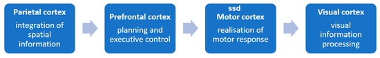 Analysis of median tmax times for individual regions suggests that both protocols’ activation direction was identical. The earliest activity was recorded in the parietal cortex, followed by the prefrontal, motor, and visual cortices. This is consistent with other works [19,20]. This indicates a possible direction of activation: from integration of spatial information (parietal cortex) [21,22,23], through planning and executive control (prefrontal cortex) [24,25,26], and execution of the motor response (motor cortex) [27,28], to processing of visual information (visual cortex) [29]. In the passive task conditions, activation is more dispersed in time, and the most pronounced delays are observed in the visual cortex, which may indicate a lower level of processing stimuli and lesser involvement of attention.