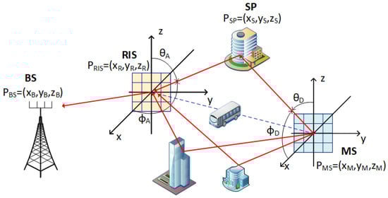Figure 1 also shows the coordinate system adopted. A wave propagation direction is specified by an azimuth angle measured from the positive x-axis and an elevation angle measured from the z-axis. The 3D positions of the communicating nodes are given as , , and for the BS, RIS, and MS, respectively, while the locations of the single bounce scatter points are in the format, where denotes the jth multipath.