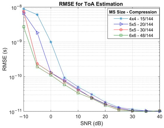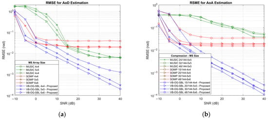 In RIS-assisted MIMO systems, acquiring full-dimensional array observations at the BS is not feasible due to excessive training overhead [33]. Therefore, a sampling matrix or a compressive sensing matrix is applied to reduce signal dimensionality prior to processing. In RIS-assisted systems, the reflection coefficients inherently act as a compression matrix, compressing spatial information [42,43]. Therefore, AoA estimation in RIS-assisted MIMO systems becomes a compressed sensing problem, where sparse angular support must be recovered from a subset of compressed measurements. Among the SSR methods, greedy algorithms like OMP and SBL adapt well to the compressive setting, while MUSIC and ESPRIT require significant adaptation [30,44].