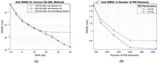 The number of studies that apply SBL-based AoA estimation in MIMO systems with UPAs is still limited, mainly due to the significantly increased dictionary size associated with 2D angle grids. To address this, several hybrid estimation approaches have been proposed. For instance, refs. [39,40] adopt a block-OMP method for elevation estimation followed by SBL for azimuth recovery using block-sparse priors to reduce complexity. Additional works such as [41] employ CoSaMP-SBL hybrid methods for joint azimuth–elevation estimation, where CoSaMP prunes the dictionary before Bayesian refinement. Off-grid SBL extensions in RIS-MIMO systems also exist: for instance, refs. [36,37] implement OG-SBL in UPA-based MIMO systems to refine AoA estimates. In [35], the concept is extended to active element-based RIS-assisted MIMO architectures to decouple the BS-RIS and RIS-MS channels, with Newton-based refinement of angular estimates. However, the estimates are largely based on the active elements. These strategies confirm that standard SBL alone is often impractical in high-dimensional UPA systems and that dimensionality reduction, hybridization, or structural sparsity must be taken into account for computational feasibility.